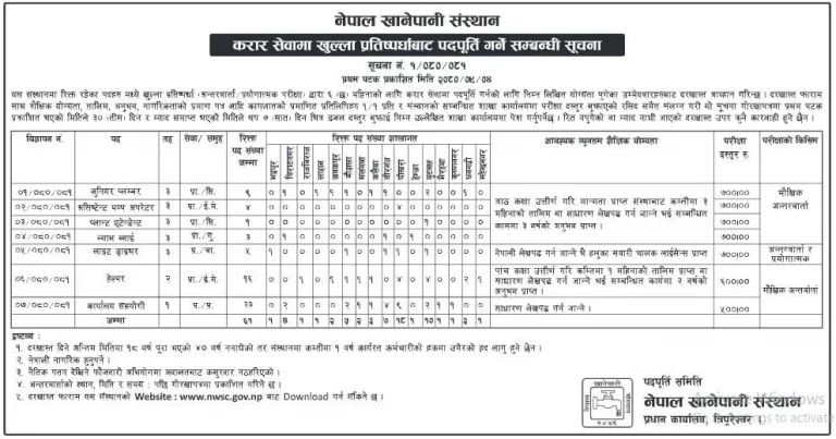 संस्थानले रिक्त पदहरूमा खुला प्रतिस्पर्धा अन्तर्वार्ता र प्रयोगात्मक परीक्षाद्वारा ६ महिनाका लागि करार सेवामा पदपूर्ति गर्न लागिएको जनाएको छ । खानेपानी संस्थानले आफ्ना विभिन्न शाखामा गरी ६१ जना कर्मचारी मागेको छ ।