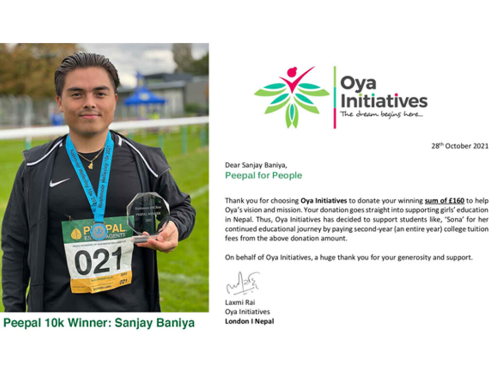 Furthermore, the sponsor had 4 Team members that participated in the run. At the office, they did a good old side bet on who the PEEPAL 10k Winner could be? The winner would then donate the funds raised to their charity of choice. PEEPAL 10k Winner was none other than Sanjay. He decided to donate his winning sum of £160 to Oya Initiatives to help them with their charitable efforts!