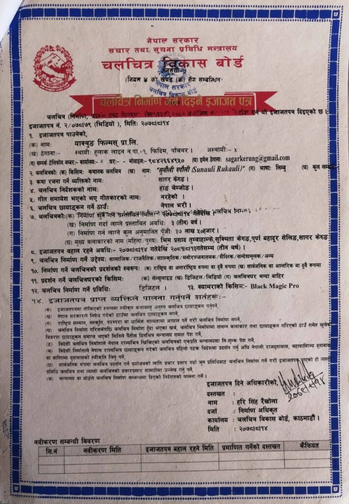 काठमाडौं । लिम्बू भाषा, कला, संस्कार संस्कृतिमा आधारित लिम्बु कथानक चलचित्र ‘सुनौली रुपौली’ चलचित्र बन्ने भएको छ । चलचित्र निर्माण गर्न मंगलबार चलचित्र विकास बोर्डबाट निर्माण इजाजत पत्र लिएको हो ।