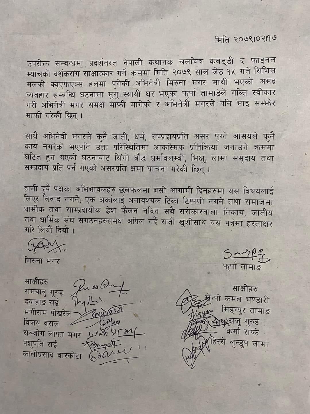 ‘अभिनेत्री मिरूना मगरमाथि भएको अभद्र व्यवहारसम्बन्धी घटनामा मुगु स्थायी घर भएका फुर्पा तामाङले गल्ती स्वीकार गरी अभिनेत्री मगरसमक्ष माफी मागेको र अभिनेत्री मगरले पनि भाइ सम्झेर माफी गरेकी छिन्,’ मिलापत्रमा उल्लेख छ।