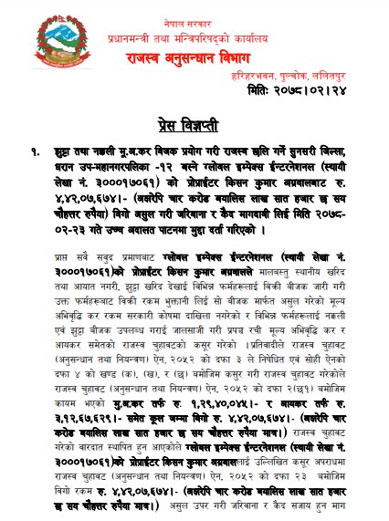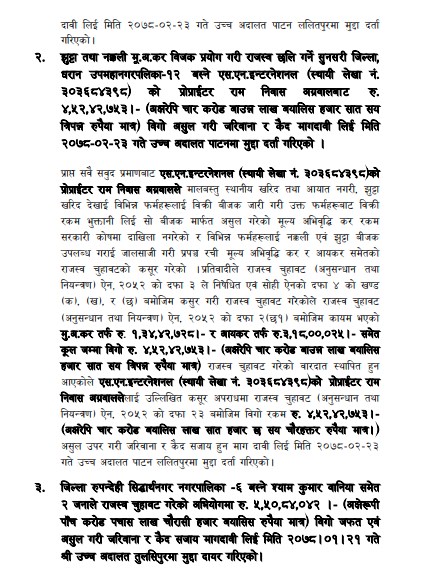 विभागले दुबै जनालाई सोही बमोजिम बिगो असुल गरी जरिवाना र कैद मागवादी गर्दै गत आइतबार उच्च अदालत पाटनमा मुद्दा दर्ता गरेको हो। मुद्दा दायर गरिएका एसएन इन्टरनेशनलका सञ्चालक रामनिवास अग्रवालको भने निधन भइसकेको छ ।