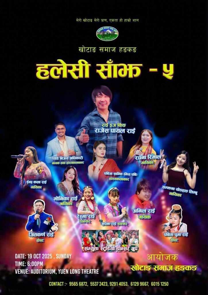 हङकङ । खोटाङ समाज हङकङले सांगीतिक कार्यक्रम हलेसी साँझको पाँचौं संस्करण आयोजना गर्ने भएको छ । समाजका अध्यक्ष पेङ किरातको अध्यक्षतामा गरिएको जानकारी सभामा ‘हलेसी साँझ–५’को पोस्टर सार्वजनिक गरिएको थियो ।