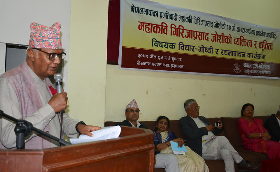 काठमाडौं । नेपाल प्रज्ञा–प्रतिष्ठान, साहित्य (मातृभाषा) विभागद्वारा नेपालभाषाका प्रगतिवादी महाकवि गिरिजाप्रसाद जोशीको ८४ औँ जन्मजयन्तीका सन्दर्भमा ‘महाकवि गिरिजाप्रसाद जोशीको व्यक्तित्व र कृतित्व’ विषयक विचार–गोष्ठी तथा रचनावाचन कार्यक्रमको आयोजना गरियो । गोष्ठीमा महाकवि जोशीको व्यक्तित्व र कृतित्वका विषयमा चर्चा गरिएको थियो ।