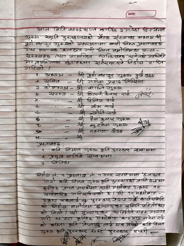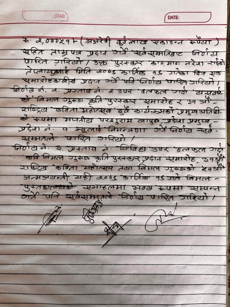 पुरस्कार कात्तिक १९ गते आयोजना हुने ३१ औ राष्ट्रिय कविता महोत्सव तथा विमल गुरुङको ५१ औं जन्म जयन्तीको अवसरमा प्रदान गरिने छ ।