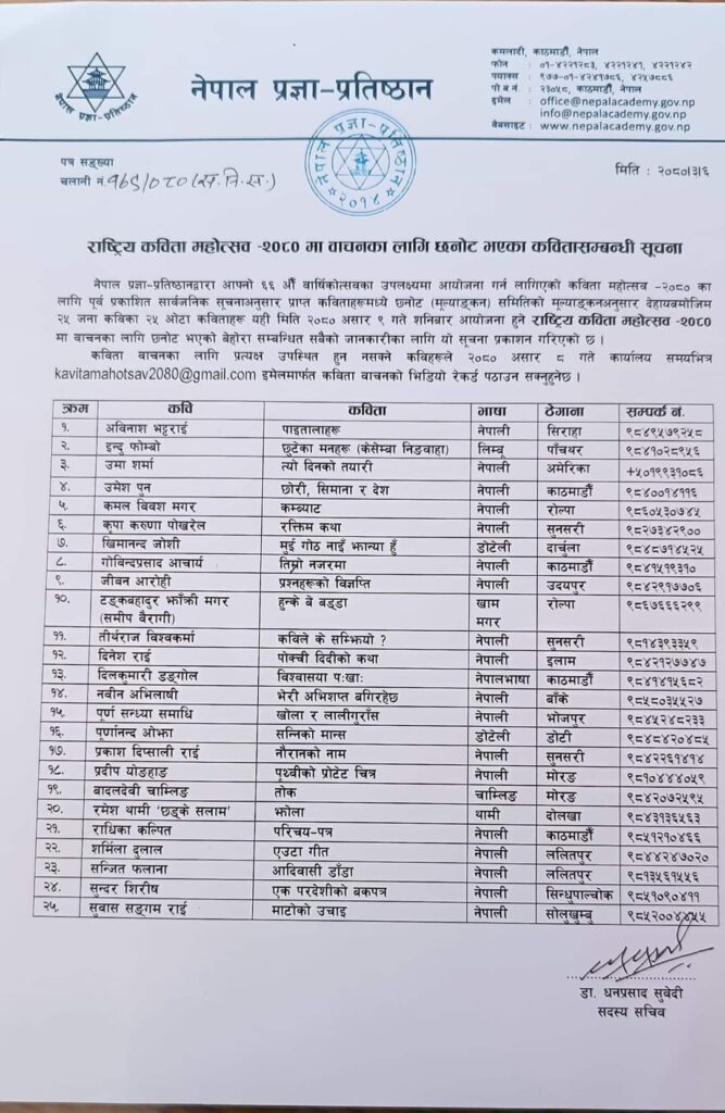 काठमाडौं । राष्ट्रिय कविता महोत्सव – २०८० कविता वाचनका लागि छनोट भएका २५ कविहरूको नाम सार्वजनिक भएको छ । नेपाल प्रज्ञा प्रतिष्ठानद्वारा आफ्नो ६६ औं वार्षिकोत्सवका उपलक्ष्यमा आयोजना हुने महोत्सवका लागि विभिन्न मातृभाषासहितका कविहरू छनौट भएका छन् ।