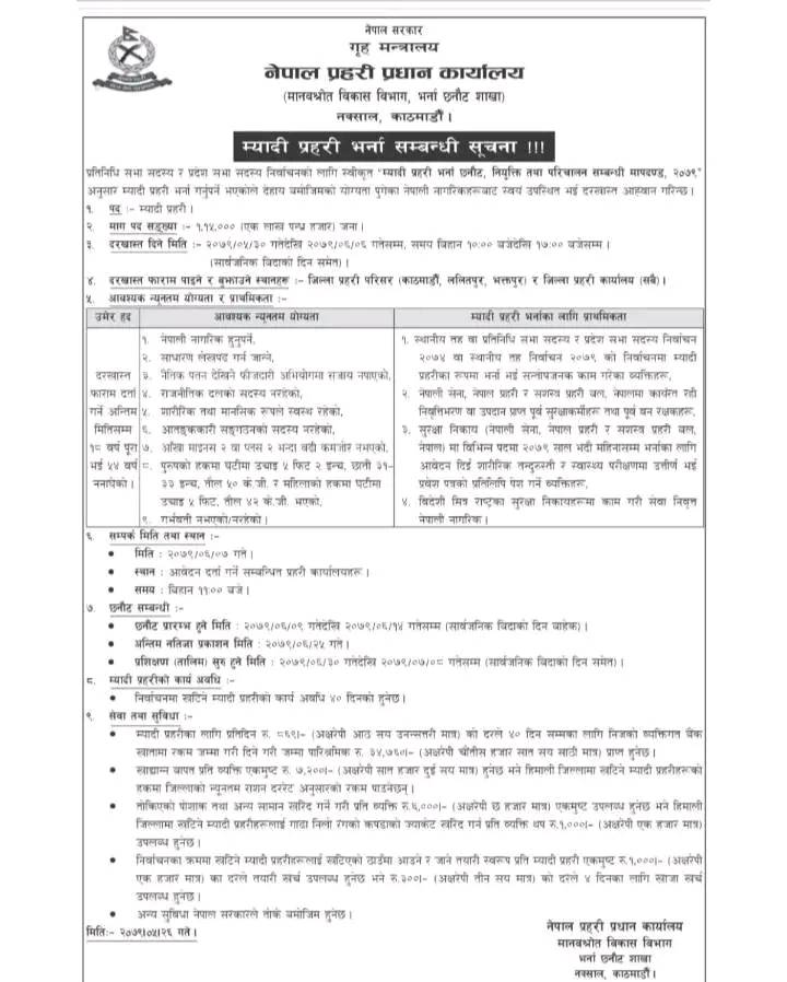 प्रधान कार्यालय मानव श्रोत विकास विभागको भर्ना छनौट शाखाले म्यादी प्रहरी भर्ना छनौट, नियुक्ति तथा परिचालन सम्बन्धी मापदण्ड, २०७९ अनुसार एक लाख १५ हजार म्यादी प्रहरीका लागि दरखास्त आह्वान गरेको हो।