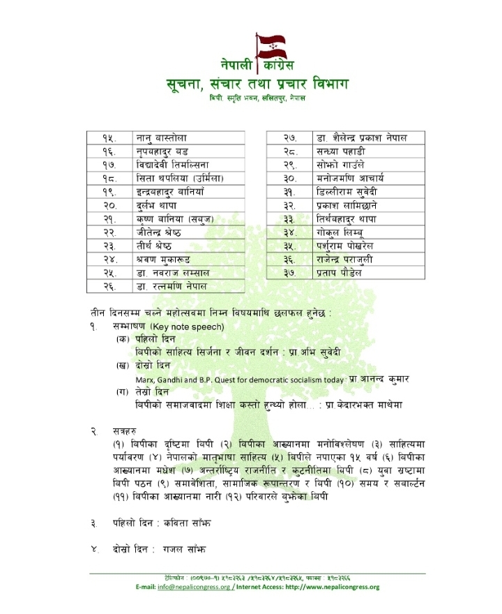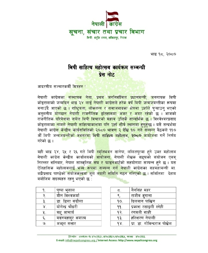 कांग्रेसको साउन पहिलो साता बसेको केन्द्रीय समितिको निर्णयअनुसार भदौ २४ देखि २६ गतेसम्म सानेपामा बिपी साहित्य महोत्सव आयोजना हुँदैछ ।