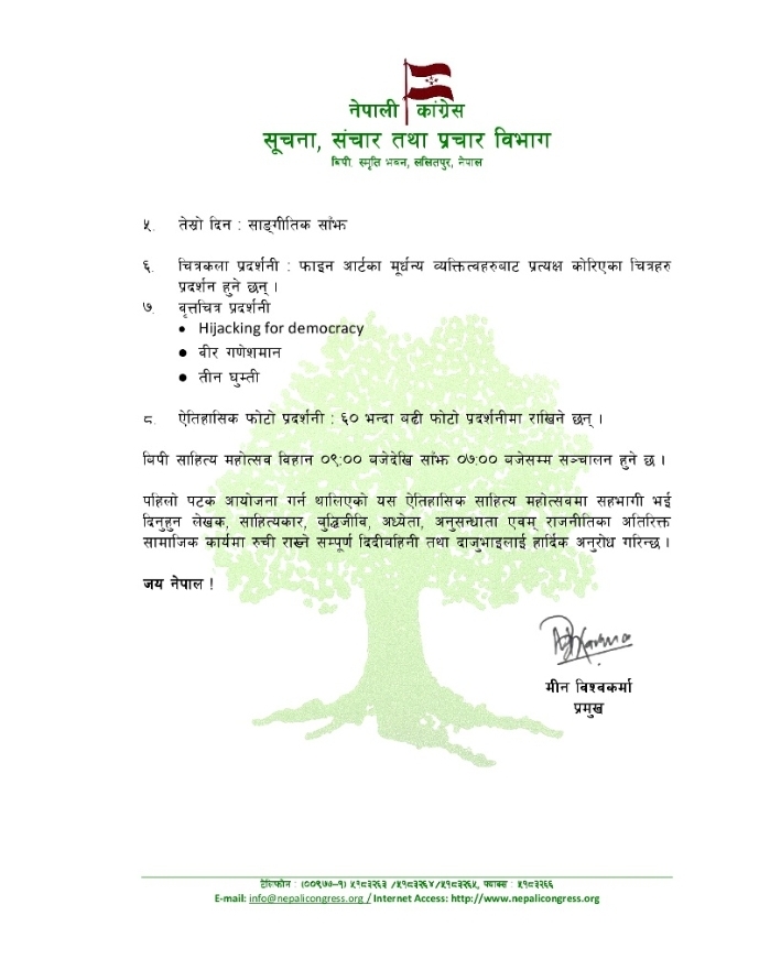 कांग्रेस केन्द्रीय कार्यालयको आयोजना, नेपाली लेखक संघको संयोजन र निरन्तर शनिबार, नेपाल साँस्कृतिक संघ, फाइनआर्टको सहयोगमा महोत्सव गर्न लागिएको हो ।