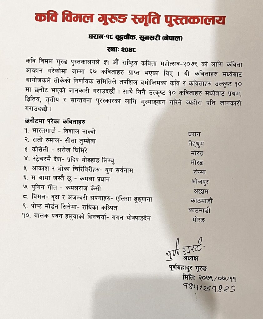 यिनै १० उत्कृष्ट कविताहरुबाट पुरस्कृत गरिने आयोजकले जनाएको छ । प्रतियोगितामा प्रथम हुनेले रु. २१ हजार, द्वितीयले रु. १७ हजार, तृतीयले रु. ११ हजार र सान्तवनाले रु. १० हजार पुरस्कार प्राप्त गर्नेछन् । सोही दिन २ लाखको विमल गुरुङ कृती पुरस्कार साहित्यकार नरेश काङ्माङ राईको कवितासंग्रह ‘तेप्लायु’लाई प्रदान गरिने पनि आयोजकले जनाएको छ ।