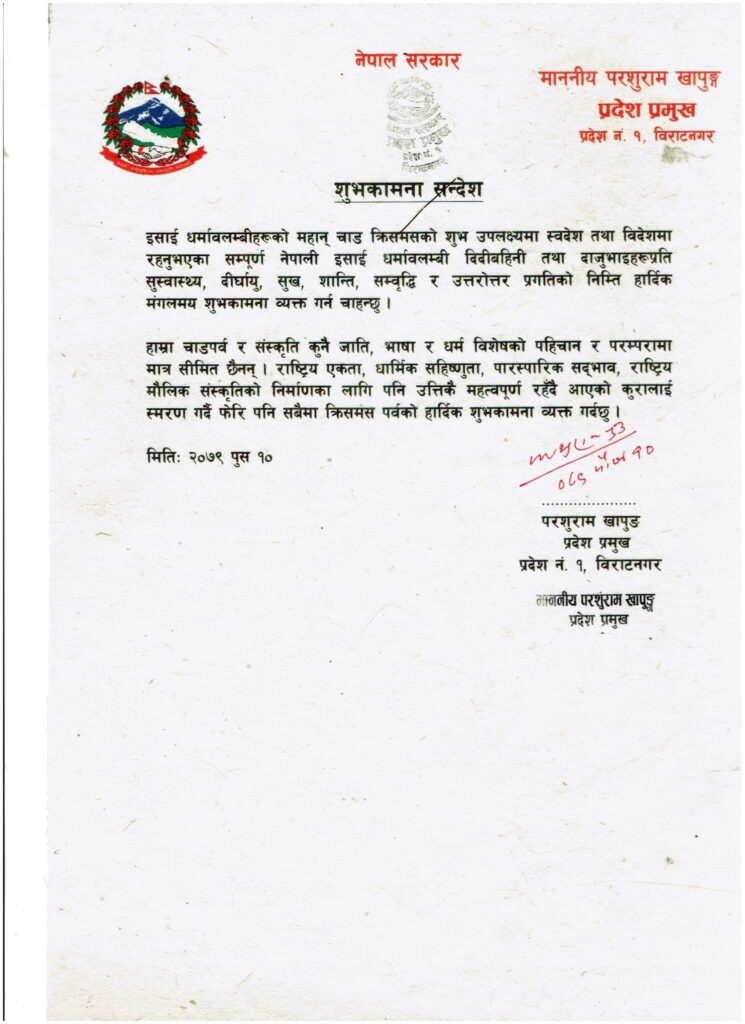 बिराटनगर । प्रदेश नम्बर १ का प्रदश प्रमुख परशुराम खापुङले क्रिसमसको उपलक्ष्यमा शुभकामना दिएका छन् । आइतबार शुभकामना सन्देश जारी गर्दै खापुङले क्रीस्चियन धर्मलम्बिहरूलाई शुभकामना व्यक्त गरेका हुन् ।