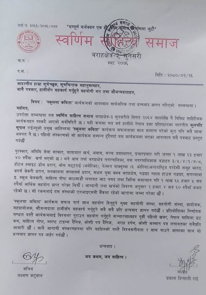 शुक्रबार (२०८०/०२/२६ गते) स्वर्णिम साहित्य समाजको नियमित वैठक पश्चात् आफ्नो अफिसियल फेसबुक पेजबाट आयव्याय सार्वजनिक गर्दै पहिलो संस्करणको कार्यक्रमले जति लोकप्रियता पायो हिसाब किताबको हिसाबले पनि संतोषजनक रहेको अध्यक्ष प्रकाश दिप्साली राई र सचिव लक्ष्मण कटुवालद्वारा हस्ताक्षर गरिएको विज्ञप्तिमा उल्लेख गरिएको छ ।