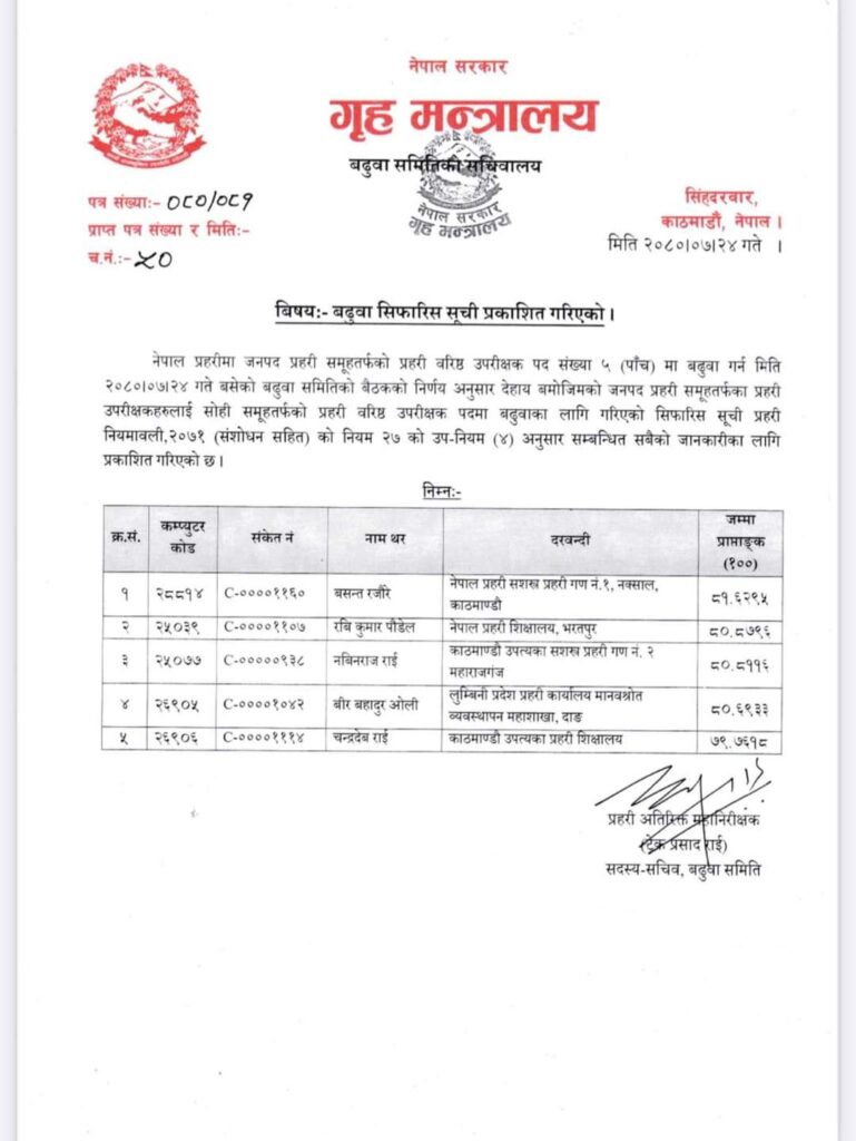 बढुवा सिफारिस हुनेमा नेपाल प्रहरी सशस्त्र प्रहरी गण नं १ नक्सालमा कार्यरत बसन्त रजौरे, नेपाल प्रहरी शिक्षालय भरतपुरमा कार्यरत रविकुमार पौडेल, काठमाडौं उपत्यका सशस्त्र प्रहरी गण नं २ महाराजगंजमा कार्यरत नबिनराज राई, लुम्बिनी प्रदेश प्रहरी कार्यालयको मानवस्रोत व्यवस्थापन महाशाखा दाङमा कार्यरत वीर बहादुर ओली र काठमाडौं उपत्यका प्रहरी शिक्षालयमा कार्यरत चन्द्रदेव राई छन्।
