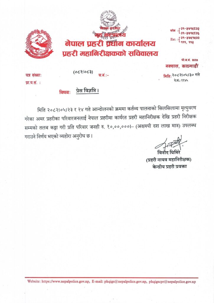 युवाहरुको आन्दोलन र त्यसपछि भएको प्रदर्शनका क्रममा कर्तव्य पालनाका क्रममा सहादत प्राप्त प्रहरीका परिवारलाई निरीक्षकदेखि आईजीपीसम्मको मासिक तलबबाट संकलन गरी प्रति परिवार १० लाख राहत दिने निर्णय गरेको छ ।