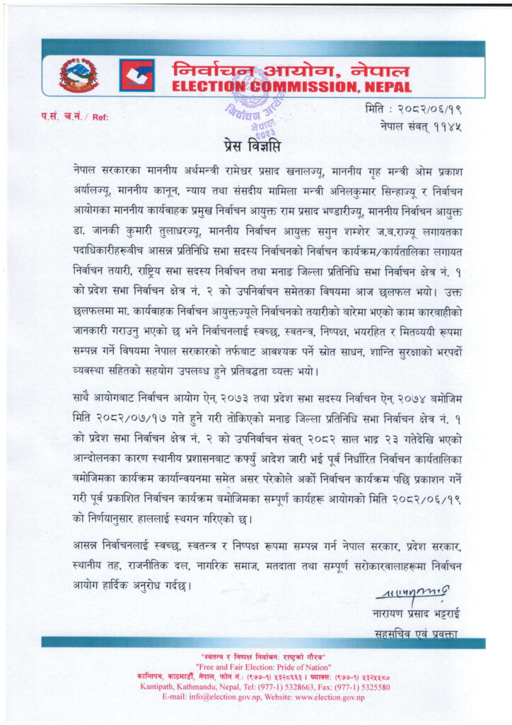भाद्र २३ गतेदेखि भएको आन्दोलनका कारण स्थानीय प्रशासनबाट कफ्र्यु आदेश जारी भई पूर्व निर्धारित निर्वाचन कार्यतालिका बमोजिमका कार्यक्रम कार्यान्वयनमा समेत असर परेकोले अर्को निर्वाचन कार्यक्रम पछि प्रकाशन गर्ने गरी पूर्व प्रकाशित निर्वाचन कार्यक्रम बमोजिमका सम्पूर्ण कार्यहरू स्थगन गरेको आयोगले प्रेस विज्ञप्तिमार्फत जनाएको छ ।