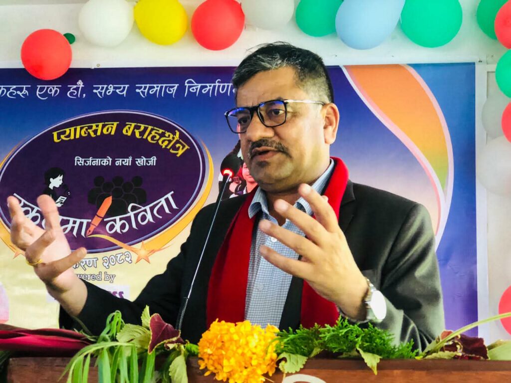 प्रमुख अतिथिको मन्तव्य राख्दै कार्यक्रमका प्रमुख अतिथि डा. नवराज लम्सालले कविता लेखन हतारको यात्रा नभएको बताए । उनले थपे, “हामी जति अनुशासित भैयो ? जति अग्रजहरुप्रति समर्पित भैयो उति लेखनमा परिपक्वता आउँछ । आजसम्म तपाईंले धेरै सहयोग गर्नेहरुलाई थ्याङ्क यु भन्नुभएको छ तर तपाईंले आफुलाई जन्माउने आमालाई कहिले भित्री मनबाट थ्याङ्क यु भन्नुभएको छ ? पक्कै छैन आज घर गएर ‘थ्याङ्क यु’ आमा भन्नुस् त । तपाईंको शक्तिशाली कविता लेखन त्यहीँबाट सुरु हुन्छ ।”