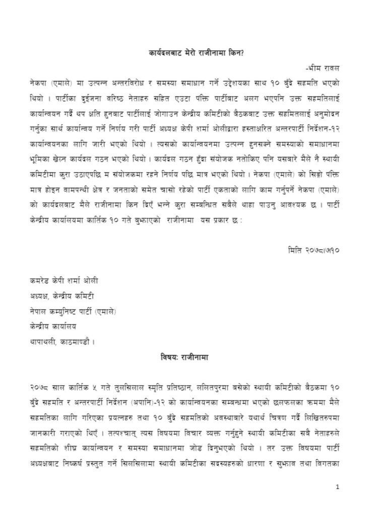कात्तिक ८ को स्थायी कमिटी बैठकमा राजीनामाको घोषणा गरेका रावलले आइतबार अध्यक्ष केपी शर्मा ओलीलाई लिखित राजीनामा बुझाएका हुन् ।