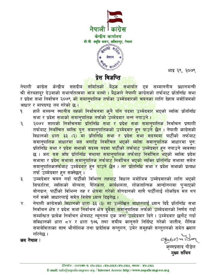 प्रधानमन्त्री निवास बालुवाटारमा बुधबार बसेको केन्द्रीय संसदीय बोर्डको बैठकले समानुपातिकतर्फ उम्मेदवार चयन गर्ने मापदण्ड तय गरेको हो । पाँच दलीय गठबन्धनमा सिट बाँडफाँट चलिरहे पनि समानुपातिकतर्फ बन्दसूची बुझाउने म्याद नजिकिदा पार्टी सभापति एंव प्रधानमन्त्री शेरबहादुर देउवाले बुधबार अपराह्न संसदीय बोर्डको बैठक बोलाएका थिए । बैठकले समानुपातिकतर्फ उम्मेदवार चयनका चार मापदण्ड तोक्ने निर्णय गरेको महामन्त्री गगन थापाले जानकारी दिए ।