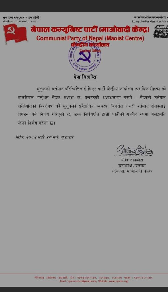 बैठकपश्चात प्रेसित विज्ञप्तिमा भनिएको छ –“मुलुकको सवैधानिक व्यवस्था विपरीत जसरी वर्तमान संसदलाई विघटन गर्ने निर्णय गरिएको छ, उक्त निर्णयप्रति हाम्रो पार्टीको गम्भीर रुपमा असहमति रहेको निर्णय गरेको छ ।”