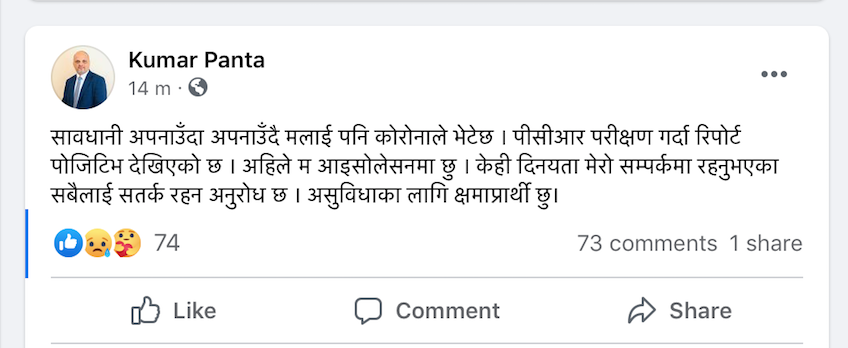 उनले फेसबूक मार्फत आफूले सावधानी अपनाउँदा अपनाउँदै पनि कोरोनाले भेटेको भन्दै केही दिनयता आफ्नो सम्पर्कमा रहेका सबैलाई सतर्क रहन अनुरोध गरेका छन् ।