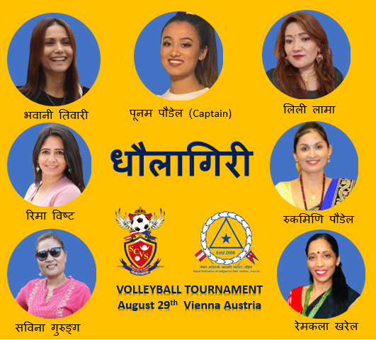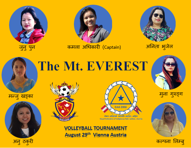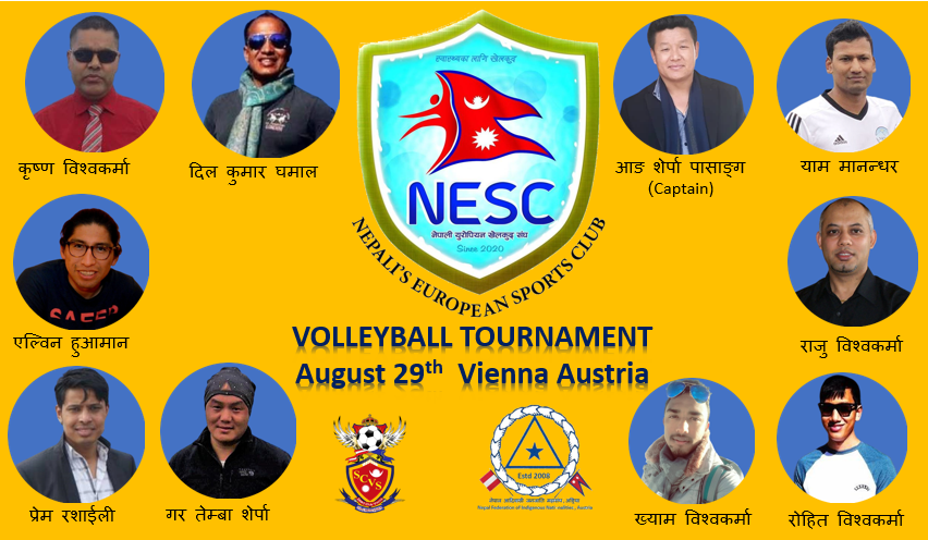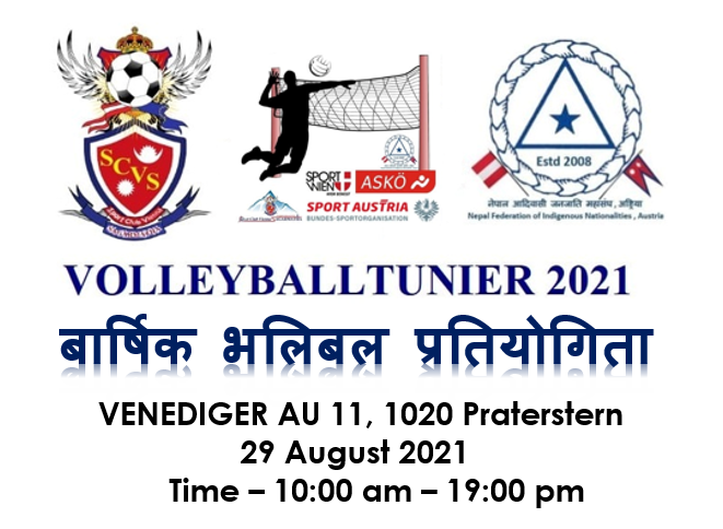 अष्ट्रियाको राजधानी भियन्नामा नेपाल आदिवासी जनजाती महासंघ अष्ट्रिया र स्पोर्ट क्लव भियन्ना सगरमाथाको संयुक्त आयोजनामा नेपाली महिला तथा पुरुषहरुको बार्षिक भलिबल प्रतियोगिता यहि २९ अगष्टमा आयोजना हुन गइरहेको छ।