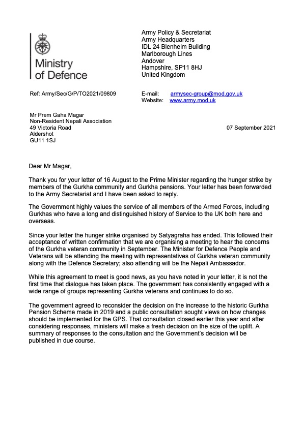 ब्रिटिश रक्षा मन्त्रालयले सेप्टेम्बर ७ मा सोही पत्रको जवाफ लेख्दै माग बमोजिम पेन्सन लगायतका सुविधा पुनराबलोकन गर्न सरकार तयार रहको जनाएको हो ।