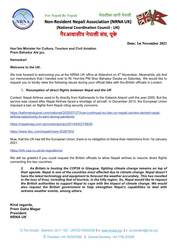 एनआरएनए युके प्रेम गाहामगरले बेलायत र नेपाल सिधा हवाइसेवाका लागि संस्थाले पहल गरिरहेको जनाए । “सिधा हवाई संचालनले नेपाललाई आर्थिक तथा पर्यटकीय फाइदा हुनेछ”, उनले भने । अध्यक्ष गाहामगरले नेपाल र बेलायतबिच सिधा हवाइसेवा संचालनका लागि ज्ञापन पत्र समेत बुझाएका छन ।