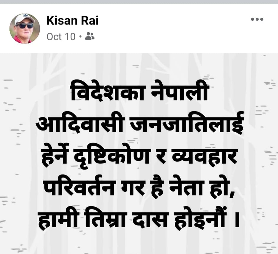 गत कात्तिक ७ गते (२४ अक्टोबर) का दिन साँझ काठमाडौंबाट मध्यपहाडी लोकमार्ग हुँदै भोजपुर जानेक्रममा किसन राईको खोटाङको दिक्तेल रुपाकोट मझुवागढी नगरपालिका–८ दोर्पाचिउरीडाँडास्थित पंखु खोलामा भीरबाट लडेर मृत्यु भएको थियो । यद्यपी पोष्टमार्टम रिपोर्ट भने आइससेको छैन । उता राईका शुभचिन्तकहरू लडेर मृत्यु भएको भन्नेमा उत्ति विस्वस्त छैनन् । ‘आदिवासी जनजाति समानन्तर संस्था खोल्न नेपाल जानुभएको थियो, वहाँले नेपालबाट सामाजिक संजालमा लेख्नुभएको स्टाटस हेर्दा यो कोणबाट पनि अनुसन्धान गर्न मिल्ला कि ?’, एकजना शुभचिन्तकले नेपाल मामिलालाई बताए ।
