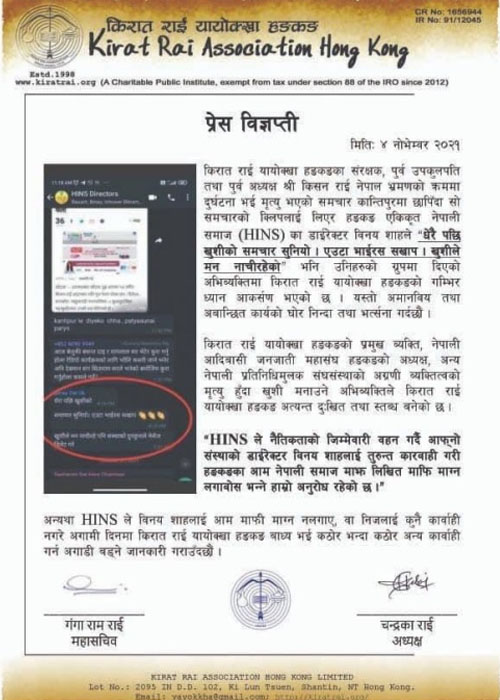 किरात राई यायोक्खा हङकङका संरक्षक र पूर्व उपकुलपति समेत रहेका किसन राईको निधनप्रति आएको उक्त अभिव्यक्ति अमानवीय र अवान्छित भएको हुँदा आम नेपालीमाझ माफी माग्नुपर्ने विज्ञप्तीमा उल्लेख गरिएको भएतापनि आफूले माफी नमाग्ने विनय शाहले नेपाल मामिलालाई बताए ।