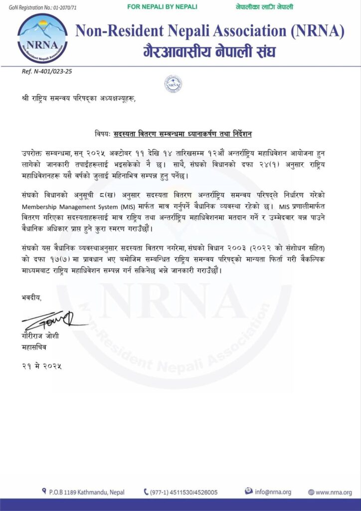 काठमाडौं । गैरआवासीय नेपाली संघ (एनआरएनए)ले अन्तर्राष्ट्रिय समन्वय परिषदको सिस्टममार्फत् सदस्यता लिन आग्रह गरेको छ ।