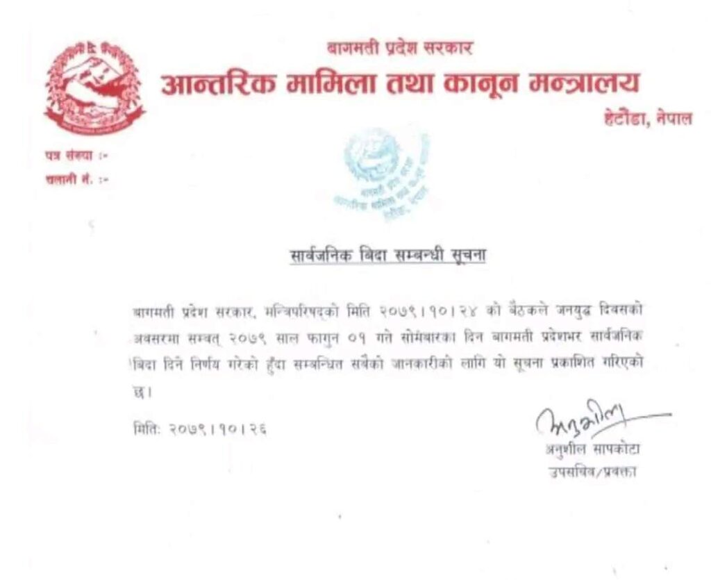 बागमती प्रदेशको गत माघ २४ गते बसेको मन्त्रीपरिषद् बैठकले बसेको मन्त्रिपरिषदको बैठकले जनयुद्ध दिवसको अवसरमा फागुन १ गते सोमबारका बागमती प्रदेशभर सार्वजनिक बिदा दिने निर्णय गरेको मन्त्रालयका उपसचिव तथा प्रवक्ता अनुशील सापकोटाले जानकारी दिएका छन् ।