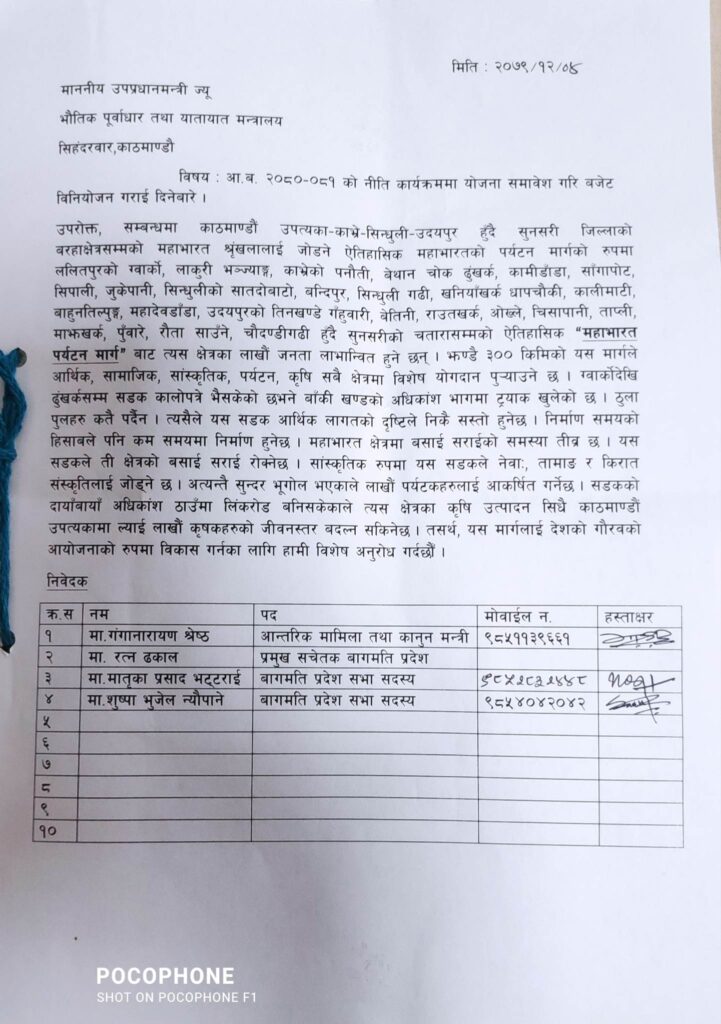 आर्थिक वर्ष २०८०–०८१ को नीति कार्यक्रममा योजना समावेश गरी बजेट विनियोजन गर्न माग गर्दै शनिबार बागमती प्रदेशका आन्तरिक मामिला तथा कानुनमन्त्री गंगानारायण श्रेष्ठको नेतृत्वमा सांसादहरू नेकपा (माओवादी केन्द्र) बागमती प्रदेश सभा दलका प्रमुख सचेतक रत्न ढकाल, बागमती प्रदेश सदस्यद्वय मातृकाप्रसाद भट्टराई र शुष्पा भुजेलले उपप्रधानमन्त्रीसमेत रहेका भौतिक पूर्वाधार तथा यातायात मन्त्री नारायणकाजी श्रेष्ठलाई एक पत्र बुझाएका छन् ।