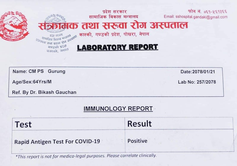 पर्वत : गण्डकी प्रदेशका मुख्यमन्त्री पृथ्वी सुब्बा गुरुङको एन्टिजेन रिपोर्ट पोजिटिभ आएको छ।