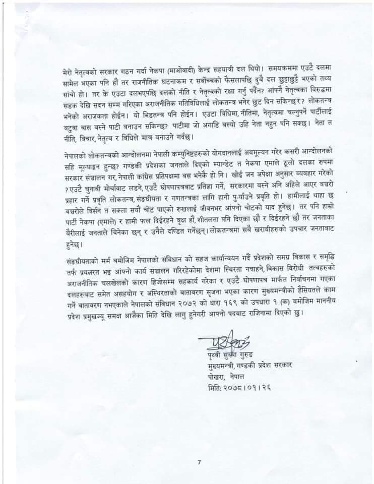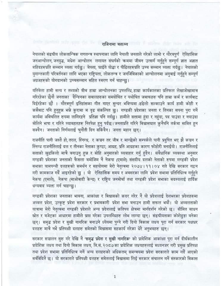 उनले संविधानको धारा १६९ को उपधारा १ (क) बमोजिम राजीनामा दिएको समेत उल्लेख गरेका छन् ।