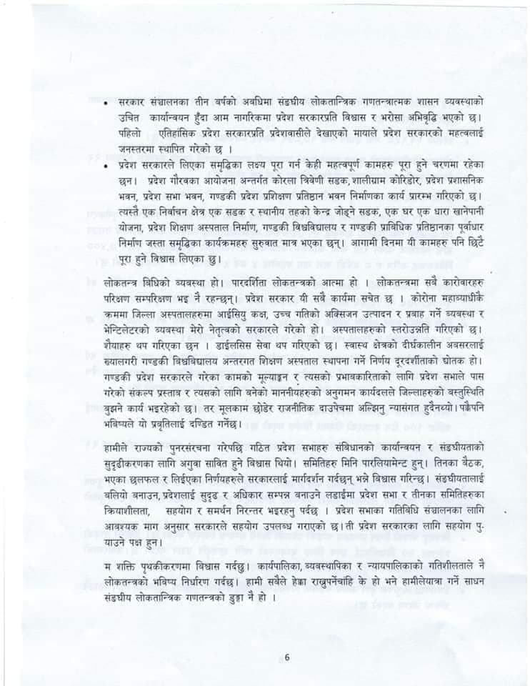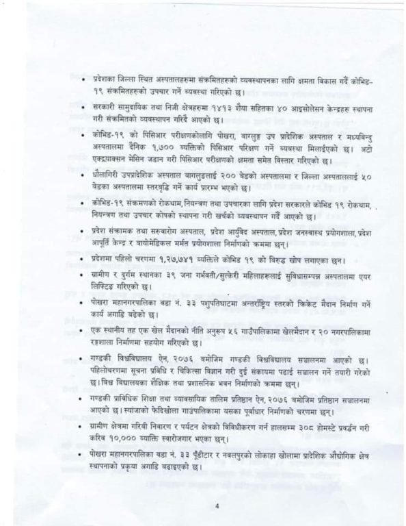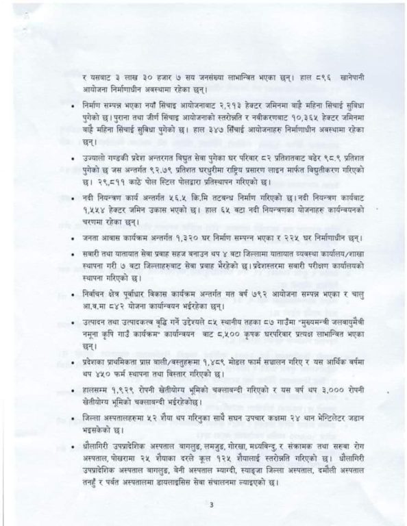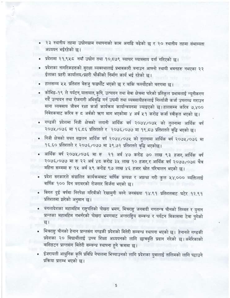 उनले राजीनामा वक्तव्यमा आफ्नो कार्यकालमा भएका कामहरुको फेहरिस्त ४९ बुँदामा उल्लेख गरेका छन् ।