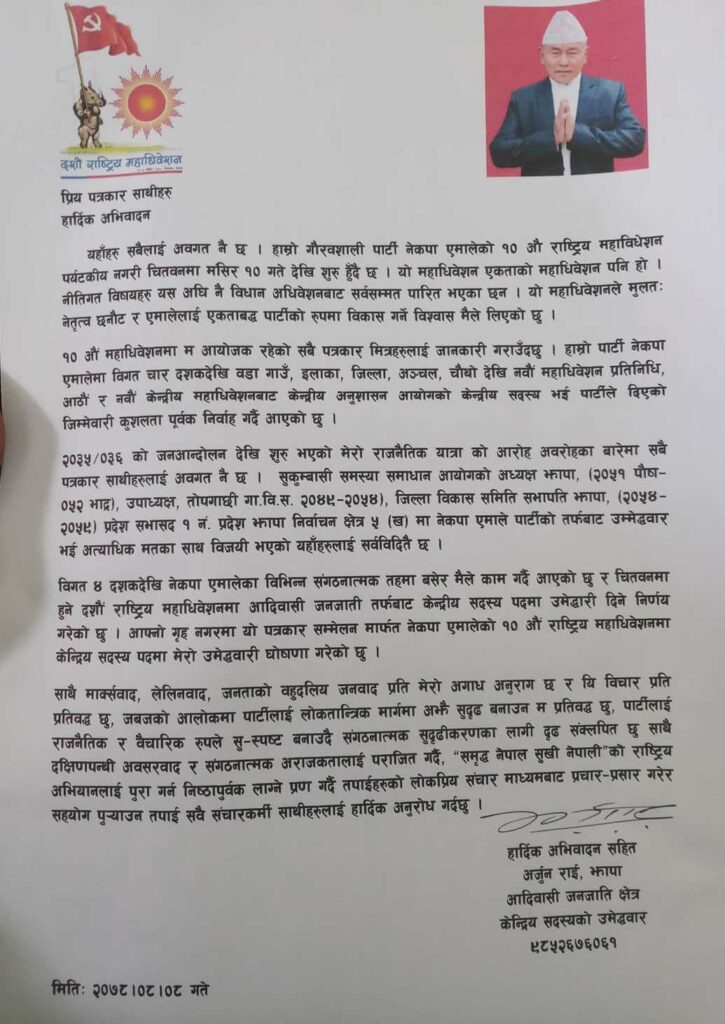 दमक । झापा क्षेत्र नम्बर ५ (ख) का प्रदेश सभा सदस्य अर्जुन राईले आसन्न १०औं एमाले महाधिवेशनमा केन्द्रीय सदस्यमा उम्मेद्वारी दिने घोषणा गरेका छन् । नेकपा एमालेभित्र शालिन, अनुशासित र निष्कलंक नेताको छवि बनाएका राईले चितवनमा मंसिर १०–१२ मा सम्पन्न हुने महाधिवेशनमा जनजाति समूहतर्फबाट केन्द्रीय सदसयमा उम्मेद्वारी दिने घोषणा गरेका हुन् ।