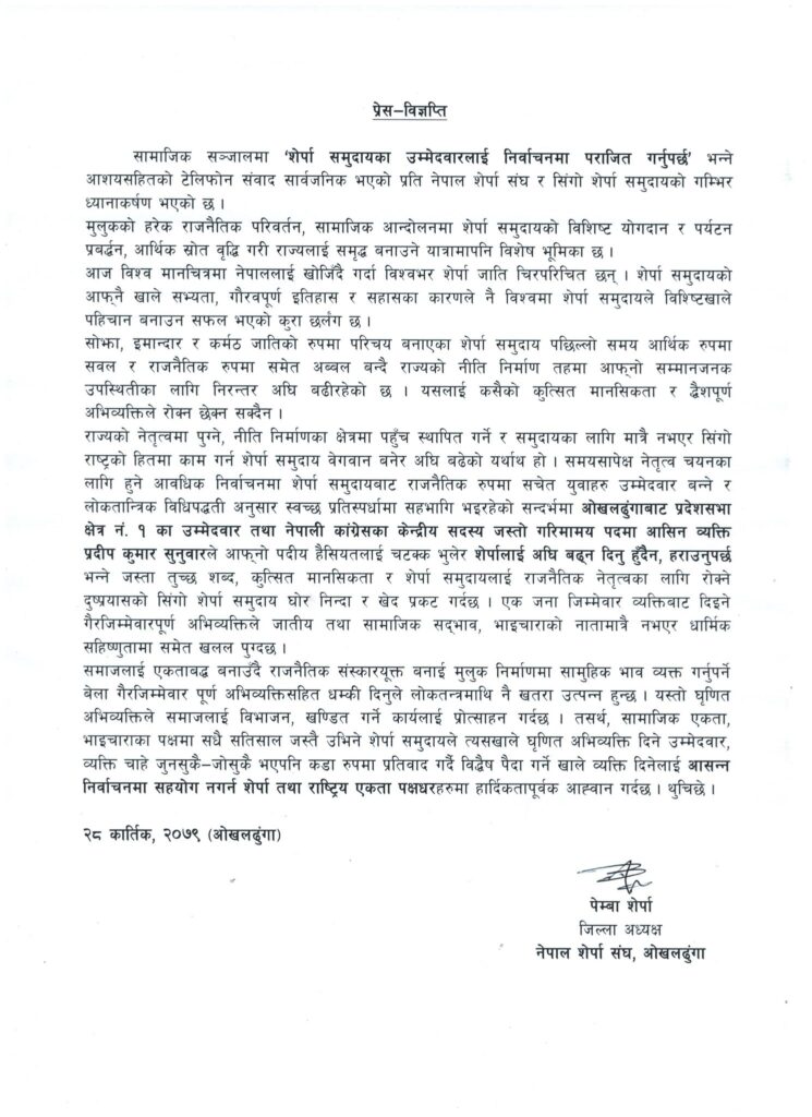 विज्ञप्तिमा भनिएको छ, ‘सोझा, इमान्दार र कर्मठ जातिको रुपमा परिचय बनाएका शेर्पा समुदाय पछिल्लो समय आर्थिक रुपमा सवल र राजनैतिक रुपमा समेत अब्बल बन्दै राज्यको नीति निर्माण तहमा आफ्नो सम्मानजनक उपस्थितीका लागि निरन्तर अघि बढीरहेको छ । यसलाई कसैको कुत्सित मानसिकता र द्वैशपूर्ण अभिव्यक्तिले रोक्न छेक्न सक्दैन ।’