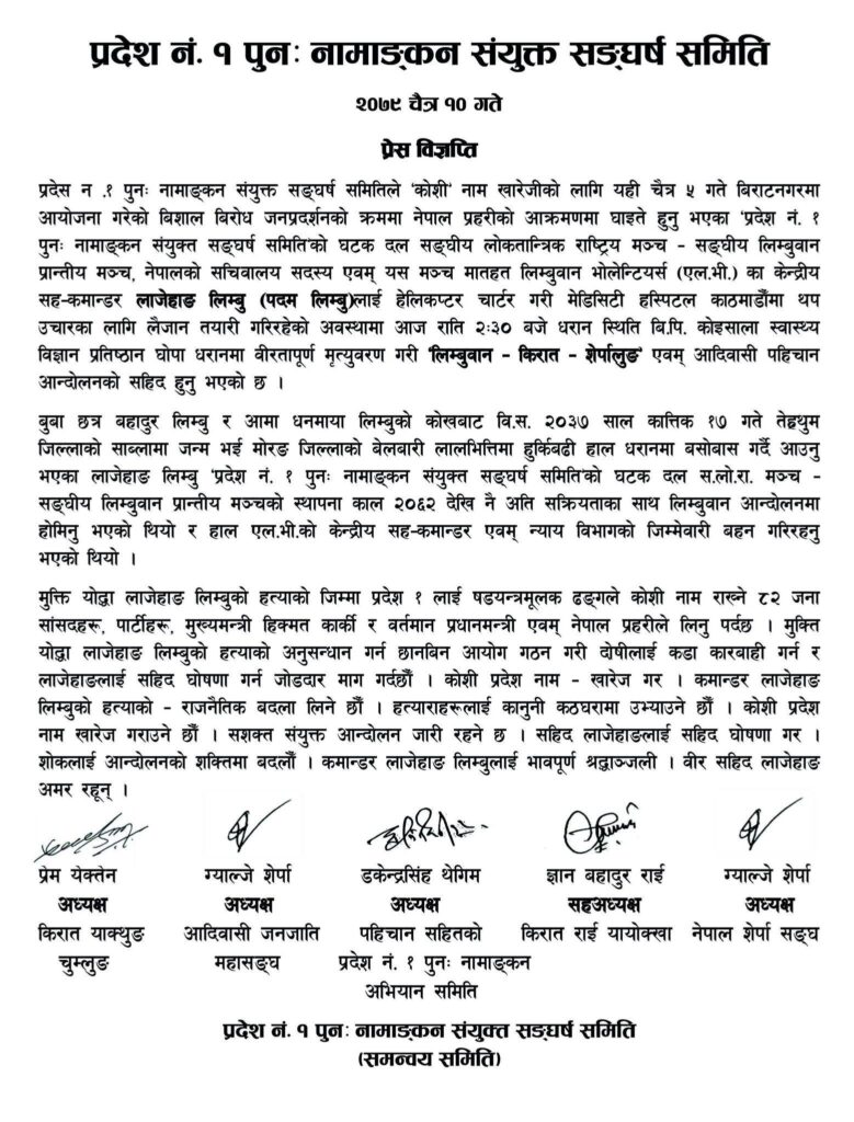 हत्याको बदला लिने पनि कियाचुले चेतावनी दिएको छ । ’कमान्डर लाजेहाङ लिम्बुको हत्याको – राजनैतिक बदला लिने छौँ । हत्याराहरुलाई कानुनी कठघरामा उभ्याउने छौँ । कोशी प्रदेश नाम खारेज गराउने छौँ । सशक्त संयुक्त आन्दोलन जारी रहने छ । सहिद लाजेहाङलाई सहिद घोषणा गर ।’, विज्ञप्तिमा भनिएको छ ।