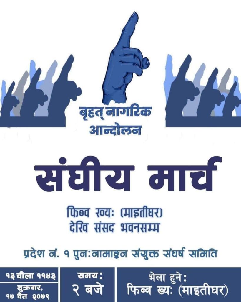 यस्तै, प्रदेश १ पुन: नामाङ्कन संघर्ष समितिको आयोजनामा १७ गते काठमाडौंमा बृहत् नागरिक आन्दोलन हुने भएको छ । दिउँसो २ बजे माइतीघर मण्डलादेखि संसद भवनसम्म संघीय मार्च हुन लागेको हो ।