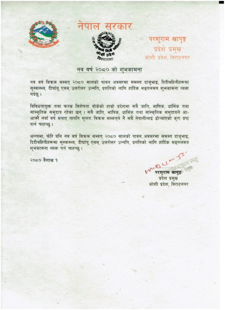 काठमाडौँ । प्रदेश नं. १ का प्रदेश प्रमुख परशुराम खापुङले नयाँ वर्ष २०८० को शुभकामना दिएका छन् ।