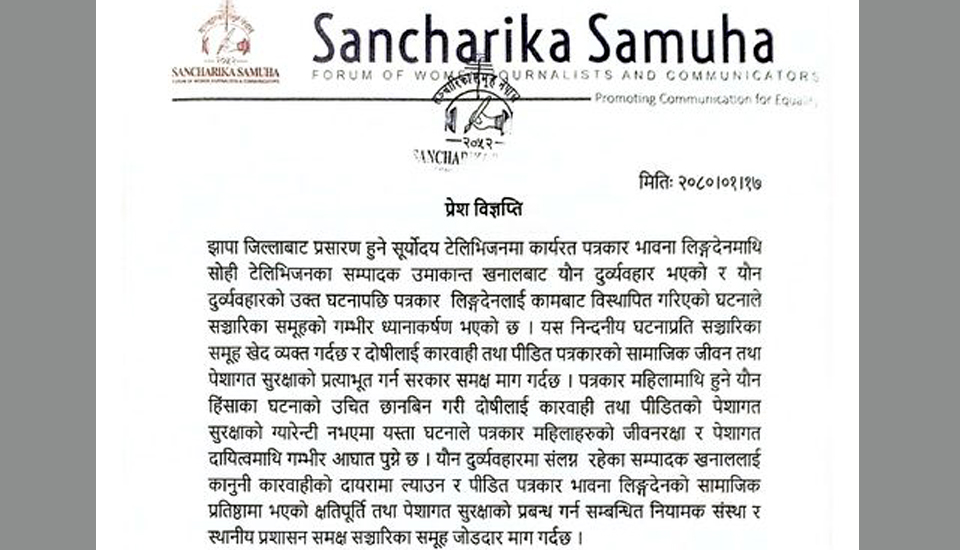 संचारिका समूहले यौन दुर्व्यवहारमा संलग्न रहेका सम्पादक खनाललाई कानुनी कारबाहीको दायरामा ल्याउन र पीडित पत्रकार भावना लिङ्देनको सामाजिक प्रतिष्ठामा भएको क्षतिपूर्ति तथा पेसागत सुरक्षाको प्रबन्ध गर्न सम्बन्धित नियामक संस्था र स्थानीय प्रशासन समक्ष माग गरेको छ । प्रेश विज्ञप्तिमा भनिएको छ, ‘पत्रकार महिलामाथि हुने यौन हिंसाका घटनाको उचित छानबिन गरी दोषीलाई कारवाही तथा पीडितको पेशागत सुरक्षाको ग्यारेन्टी नभएमा यस्ता घटनाले पत्रकार महिलाहरुको जीवनरक्षा र पेशागत दायित्वमाथि गम्भीर आघात पुग्छ । यौन दुर्व्यवहारमा संलग्न रहेका सम्पादक खनाललाई कानुनी कारवाहीको दायरामा ल्याउन र पीडित पत्रकार भावना लिङ्गदेनको सामाजिक प्रतिष्ठामा भएको क्षतिपूर्ति तथा पेशागत सुरक्षाको प्रबन्ध गर्न सम्बन्धित नियामक संस्था र स्थानीय प्रशासन समक्ष सञ्चारिका समूह जोडदार माग गर्दछ ।’